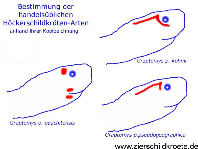 Im Zoohandel werden Höckerschildkröten leider nicht sauber nach Arten getrennt angeboten. Meistens ist es eine Mischung aus Graptemys p. pseudogeographica, Graptemys p. kohnii und Graptemys ouachitensis. Diese Höckerschildkröten kann man anhand ihrer Kopfzeichnung unterscheiden. Bei allen dreien besteht die Kopfzeichnung aus gelblichen bis elfenbeinfarbenen Linien vor dunkelgrauem Hintergrund.