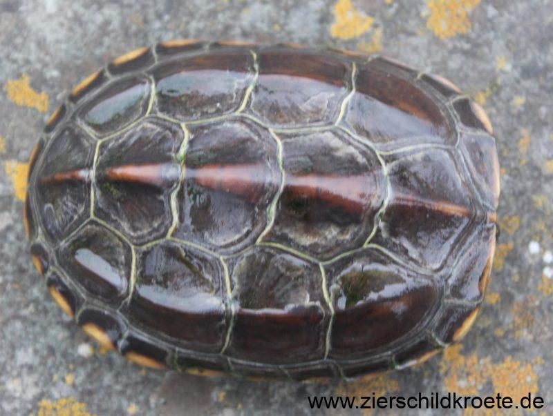 - Markierung der Nährte zwischen den Diskusschildern gleichmäßig und normal durch durch schmale Streifen, Naht zwischen 2. und 3. Wirbelschild deutlich gegen die Naht zwischen den 2. und 3. Rippenschildern versetzt, markanter gelber oder rötlicher Dorsalstreifen (besonders bei jüngeren Exemplaren): Chrysemys picta dorsalis