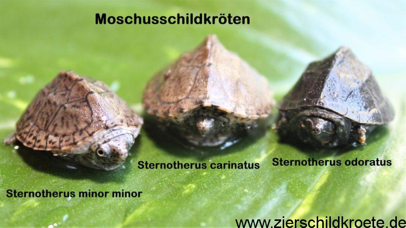 Rechts die schwarze Schildkröte ist die Gewöhnliche Moschusschildkröte (Sternotherus odoratus), das ist die häufigste Moschusschildkröte. Am zweihäufigsten im Zoohandel von den Moschusschildkröten angeboten wird die Dach-Moschusschildkröte (Sternotherus carinatus), weil sie heller ist wird sie dort manchmal als „Helle Moschusschildkröte“ bezeichnet.