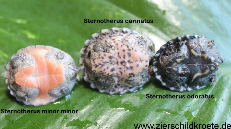 Wenn deine Schildkröte ein Kehlschild hat, dann ist es schon mal keine Sternotherus carinatus, denn bei der Dach-Moschusschildkröte fehlt das Kehlschild am Bauchpanzer. Du erkennst das so: bei der Dach-Moschusschildkröte ist jedes Schild am Bauchpanzer doppelt vorhanden. Bei der Gewöhnlichen Moschusschildkröten gibt es vorne am Kopf ein einzelnes zusätzliches Schild in der Mitte.