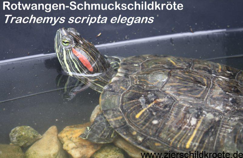 Bei der Rotwangen-Schmuckschildkröte (Trachemys scripta elegans) findet sich hinter dem Auge ein länglicher waagerechter kräftig roter Streifen.