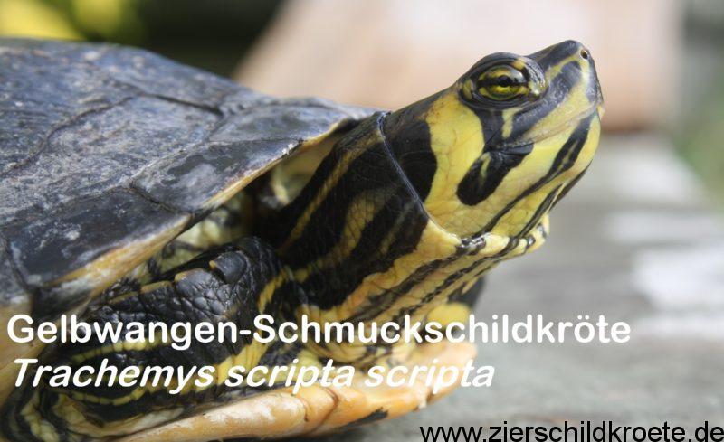 Die Gelbwangen-Schmuckschildkröte (Trachemys scripta scripta) hat hinter dem Auge einen breiten senkrechten Streifen. Der Bauchpanzer von Gelbwangen-Schmuckschildkröten hat als Jungtier gelegentlich noch eine Fleckenzeichnung, diese verschwindet aber mit dem Wachstum. In der Regel haben ausgewachsene Gelbwangen-Schmuckschildkröte nur vorne am Hals noch zwei Punkte auf dem Bauchpanzer. Daher wird diese Art im deutschen gelegentlich auch als Gelbbauch-Schmuckschildkröte bezeichnet.