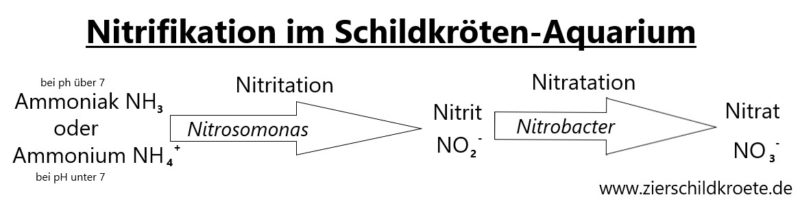 Durch Futterreste, abgestorbene Pflanzen, Kot und Urin der Wasserschildkröten sowie Haut- und Panzerschuppen gelangen Abfallstoffe in das Aquarienwasser. Diese enthalten immer organische Stickstoffverbindungen. In einem eingefahrenen Aquarium werden diese Stickstoffverbindungen mit der sogenannten Nitrifikation abgebaut. Am Ende kommt dabei Nitrat heraus, das ist die am wenigsten giftige Stickstoffverbindung im Aquarium. Aber ganz ungiftig ist sie auch nicht. Daher muss man dieses Nitrat regelmäßig entfernen. Ein Filter kann das nicht, daher muss man das Wasser austauschen.