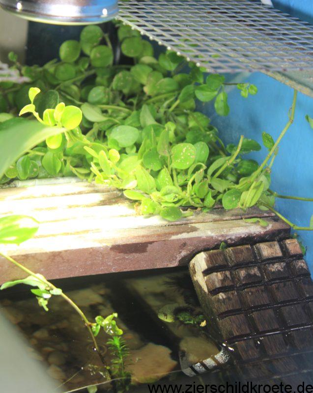 Auf dem Landteil kann man sogar Pflanzen einbringen, wenn man pflanzenfressende Wasserschildkröten hat. Denn an Land fressen Wasserschildkröten ja in der Regel nicht. Die Bepflanzung des Landteils (beziehungsweise des Eiablageplatzes) hat auch immense Vorteile: den Wasserschildkröten wird bei der Eiablage durch das Pflanzendickicht Schutz geboten, so nehmen sie den Eiablageplatz besser an. Zudem muss man die Pflanzen ja regelmäßig gießen, das führt dann automatisch dazu, dass der Eiablageplatz leicht feucht ist.