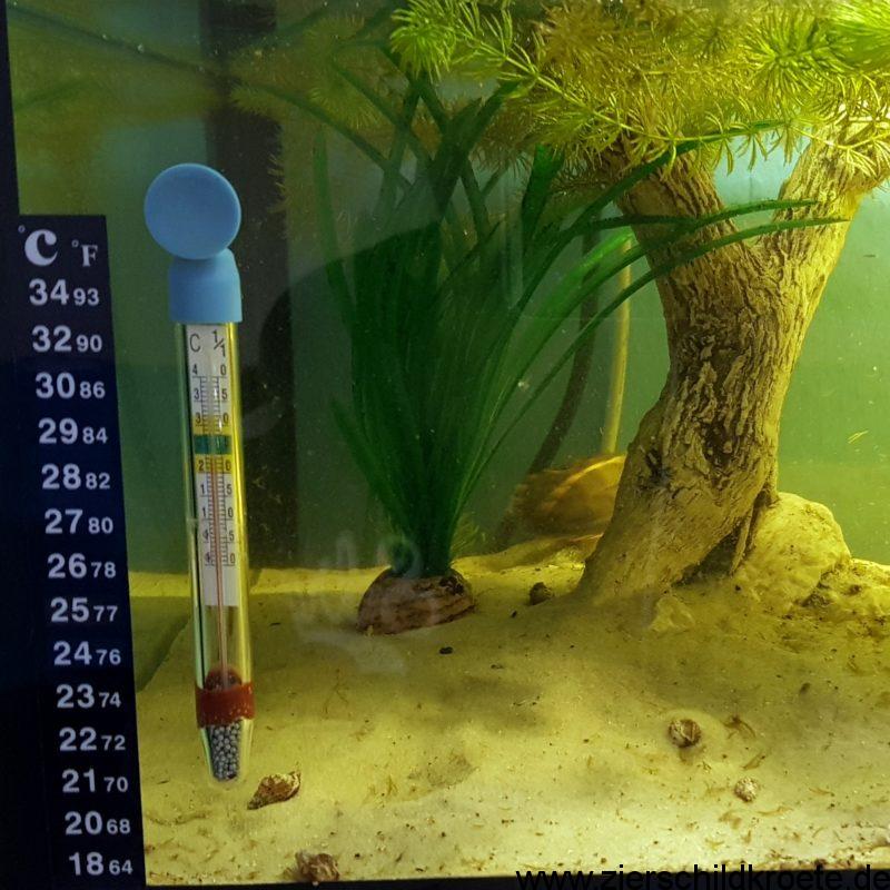 Mit einem Thermometer kannst du die Wassertemperatur im Blick behalten. Es sollte zur täglichen Routine eines Schildkrötenhalters gehören, die Temperatur zu überprüfen.
