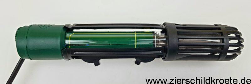 Ganz wichtig, ist dass der Heizstab vollständig untergetaucht wird. In der Regel haben Heizstäbe eine Markierung, wie weit sie mindestens untergetaucht werden müssen. Oftmals haben Schildkrötenaquarien weniger hohe Wasserstände als Fischaquarien, daher gucken die Heizstäbe aus dem Wasser heraus, wenn sie senkrecht angebracht werden. Aber die Lösung dieses Problems ist einfach: der Heizstab kann auch schräg oder waagerecht angebracht werden.