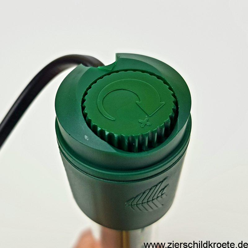 Es gibt Heizstäbe die keine Möglichkeit bieten die Temperatur zu verstellen, diese sind auf 25 °C fest eingestellt. Für die Pflege viele Fische und auch bei der Haltung von tropischen Wasserschildkröten kann man solche Heizstäbe durchaus nutzen. Aber die meisten häufig als Haustier gepflegten Arten benötigen im Jahresverlauf unterschiedliche Temperaturen, daher muss der Heizstab verstellbar sein. Meistens befindet sich dazu oben ein Rädchen, zur Einstellung der Temperatur. Ist dabei eine Temperaturscala angegeben, so würde ich sie nur zur Orientierung nutzen. Mit Hilfe eines Thermometers musst du überprüfen, ob die eingestellte Temperatur auch erzielt wird. Oftmals passt das nämlich nicht hundertprozentig.