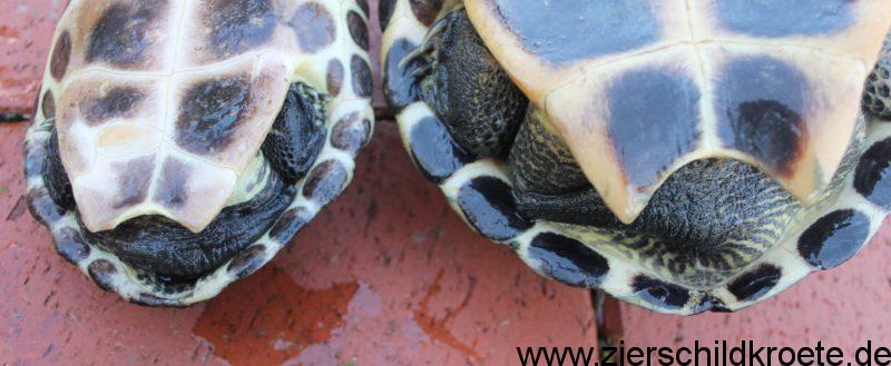 Bei Jungtieren ist eine Geschlechtsbestimmung noch nicht möglich. Zur sicheren Unterscheidung von Männchen und Weibchen sollten Streifenschildkröten mindestens 10-12 cm Panzerlänge haben.
