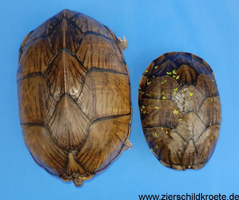 Dach-Moschusschildkröten sind die größten Moschusschildkröten, Männchen können bis 17,6 cm groß werden. In der Regel bleiben männliche Sternotherus carinatus mit 10-15 cm aber kleiner. Weibchen der Dach-Moschusschildkröte erreichen maximal 14 cm Panzerlänge. Aber nicht nur was die Länge angeht sind sie die größten Moschusschildkröten, sie sind mit ihrem dachartigen Panzer auch die höchsten und schwersten Moschusschildkröten. Ausgewachsene Sternotherus carinatus wirken regelrecht bullig.