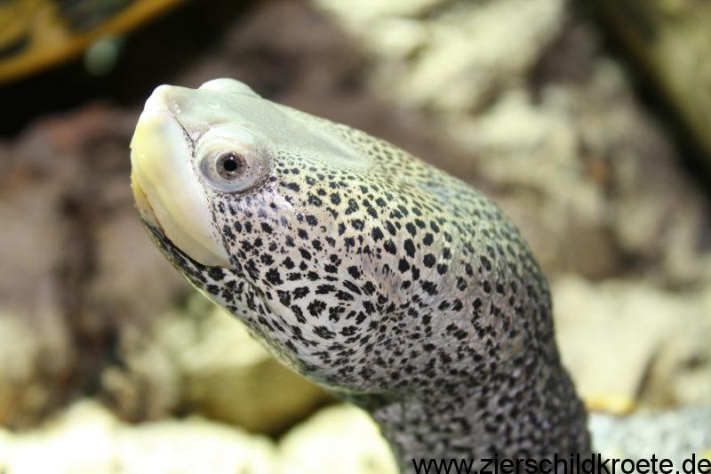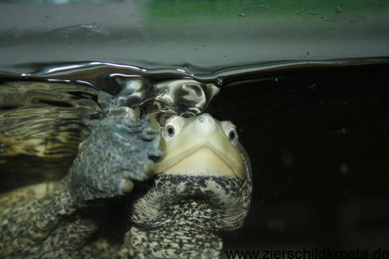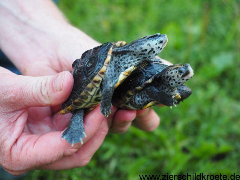 Nach genau einer Inkubationszeit zwischen 71 und 78 Tagen bei 26°C bzw. 48-52 Tagen bei 30°C strecken die Jungtiere ihre Köpfchen aus dem Ei. Normalerweise verweilten sie noch einen Tag im Ei und krabbeln dann erst im Inkubator herum. Fast alle Jungtiere haben bei mir noch einen relativ prominenten Dottersack, meist ist er etwa Bohnengroß. Die Schlüpflinge werden dann nicht sofort in ein Aquarium gesetzt, sondern auf ein mit 2%iger PVP-Jod-Lösung getränktes Zellstofftuch in den Inkubator gesetzt. Nach spätestens einer Woche ist der Dottersack vollständig resorbiert und das Schildkröten können ein Aquarium mit Süßwasser beziehen.