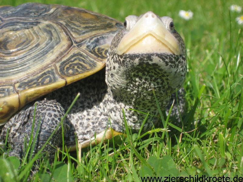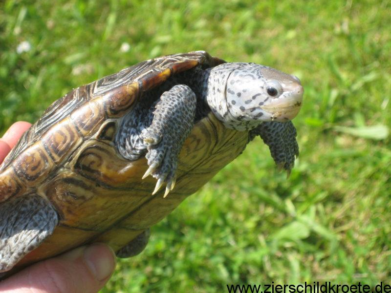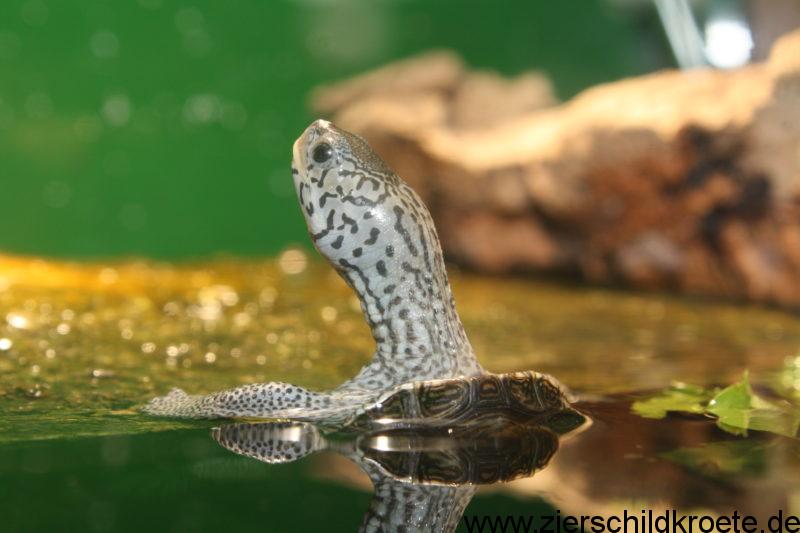 In der Unterfamilie der Schmuckschildkröten-Artigen Deirochelyinae sind die Diamantschildkröten ganz besondere Tiere. Als erstes fällt auf dass alle anderen Schmuckschildkröten-Artigen (Chrysemys picta, Pseudemys-Arten, Trachemys-Arten, Deirochelys reticularia, Graptemys-Arten) mehr oder weniger gleich aussehen, ihre Haut hat gelbe Streifen auf braun-olivem Grund. Ganz anders die Diamantschildkröten, sie haben eine graue Haut mit schwarzen Punkten. Manch einer wird sich natürlich fragen was an grau-schwarz gepunktet schöner sein soll als an gelb-oliv gestreift. Ich gebe zu, das ist natürlich Geschmackssache.
