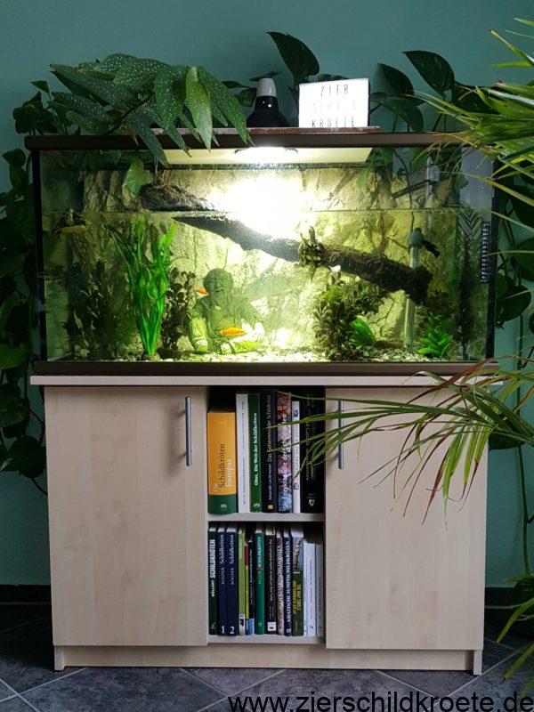 Für den Anfang reicht bei einem Schlüpfling auch ein kleineres Aquarium mit 60 oder 80 cm Kantenlänge. Da die Wasserschildkröte jedoch wächst, und je nach Haltung gar nicht mal so langsam, benötigt man später ein größeres Aquarium. Natürlich kann man auch gleich ein Aquarium mit den später für die ausgewachsene Wasserschildkröte benötigten Maßen kaufen, aber die Sache hat einen Haken. Ist das Aquarium im Verhältnis zur Baby-Schildkröte riesig, so ist die Kontrolle des Tieres schwieriger. Daher ist es ok erstmal mit einem kleineren Aquarium zu starten.