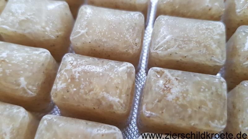 Es gibt auch spezielles Schildkrötenfrostfutter*, welches pro Blister eine Mischung aus Fisch, Putenherz, Muscheln, Garnelen, Bachflohkrebsen, Mysis, Roten Mückenlarven, Rindfleisch, Spinat und Spirulina enthält.