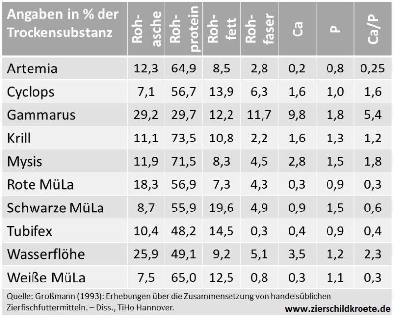 Schnell fällt auf, dass die Futtertiere, die zu den Krebsen gehören, vom Ca/P-Verhältnis deutlich besser abschneiden, als Insekten. Cyclops, Gammarus, Krill, Mysis und Wasserflöhe enthalten mehr Kalzium als andere Frostfutter. Der Protein-Gehalt von tierischen Futtermitteln ist allgemein hoch, auffällig niedriger ist er lediglich bei den Bachflohkrebsen.