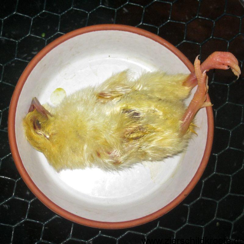 Küken sind ein „Abfallprodukt“ welche bei der „Produktion“ von Legehennen entstehen. Die Männlichen Tiere werden aussortiert und abgetötet. Für große Tiere wie Schnappschildkröten sind sie gut geeignet. An Schildkröten die die Küken nicht in einem Stück schlucken können verfütter ich sie nicht, da der im Küken enthaltene Dottersackrest eine große Sauerei gibt.