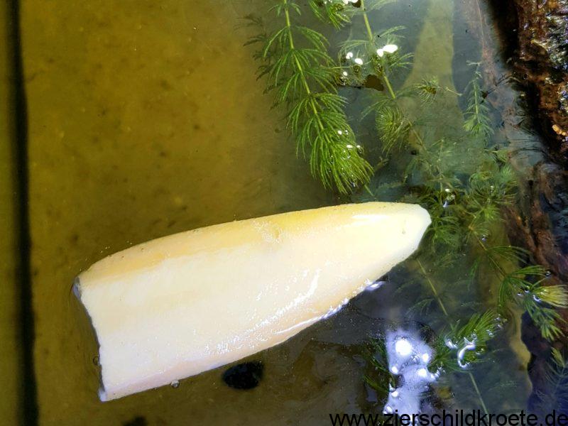 Ich habe in meinen Schildkrötenbecken immer ein Stück Sepia schwimmen, so können die Schildkröten ganz nach Bedarf sich etwas abbeißen. Anfangs schwimmen die Schulps an der Wasseroberfläche, manche sinken nach einiger Zeit, andere nicht, wieso hab ich noch nicht raus gefunden. Auf dem Foto seht ihr zwei frische Sepia-Schale und daneben eine die schon einige Zeit im Schildkrötenaquarium geschwommen ist.