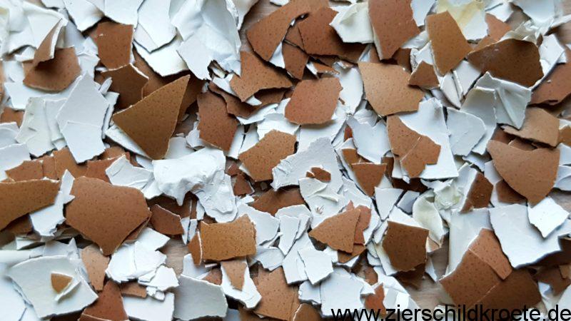 Auch Stücke von Eierschalen werden gelegentlich zur Kalkversorgung eingesetzt, aber es gibt Hinweise darauf, dass Eischalen schlecht verdaulich sind. Den Schildkröten steht das Kalzium aus Eischalen also nicht zur Verfügung. Daher würde ich Eischalen nicht einsetzen. Wenn Eischalen eingesetzt werden, dann sollten sie abgekocht werden damit eine Salmonellen-Übertragung ausgeschlossen werden kann.