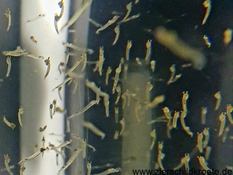 Jungtiere von Wasserschildkröten fressen in der ersten Zeit oft nur Lebendfutter, da sind Mückenlarven in allen Farben gerade zu ideal. Auch wenn andere Schildkröten nicht fressen wollen gebe ich ihnen rote Mückenlarven. Meist fressen sie dann, rot wirkt auf Schildkröten anziehend. Für ausgewachsene Schildkröten sind Mückenlarven auf Grund ihrer Größe weniger geeignet. Wenn man Mückenlarven nicht in irgendwelchen Gewässern (eine Regentonne im Garten reicht im Sommer schon) selbst fangen kann, so bieten viele Zoohandlungen inzwischen auch lebende Mückenlarven zum Verkauf an. Sollten diese nicht sofort verfüttert werden, so empfiehlt es sich die Mückenlarven im Kühlschrank zu lagern, so sind sie länger haltbar.