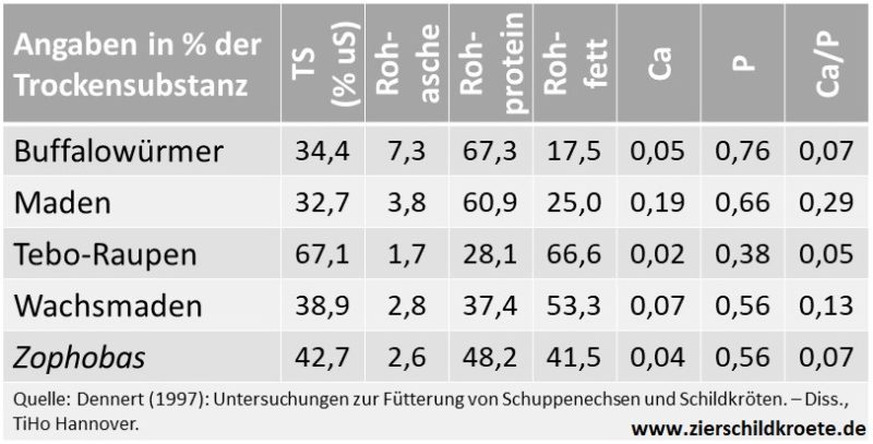 Untersucht wurden folgende Futtertiere: Fruchtfliegen, Hausfliegen, Heuschrecken, Heimchen, Mehlwürmer, Regenwürmer, Schaben (diverse), Seidenraupen, Soldatenfliegenlarven, Teboraupen, Wachsmaden und Zophobas (FINKE 2002, FINKE 2013, OONINCX & DIERENFELD 2012).
