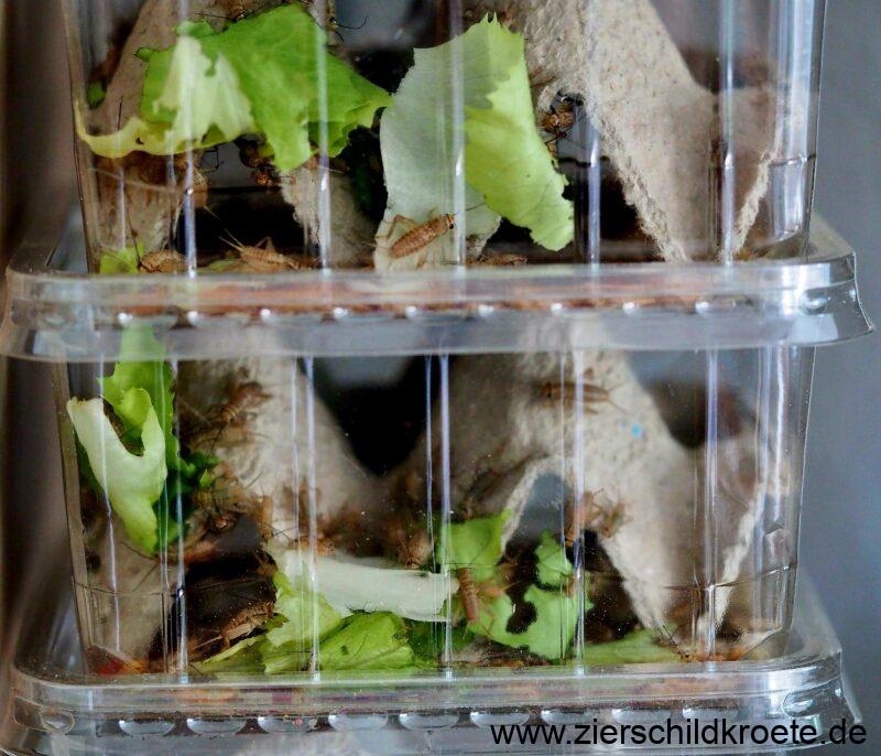 Auch Futtertiere haben ein Recht auf artgerechte Haltung! Das ist in den kleinen Plastikdosen in welchen sie im Handel angeboten werden nicht möglich. Ich halte meine Futterinsekten in Faunaboxen welche mit etwas Sand auf dem Boden, einem Ast, einer Schale Wasser (mit einem Schamm drin, damit die Tiere nicht ertrinken) und Futter ausgestattet sind. So vermehren sich die Futterinsekten zwar noch nicht, aber sie können lange „aufbewahrt“ werden.