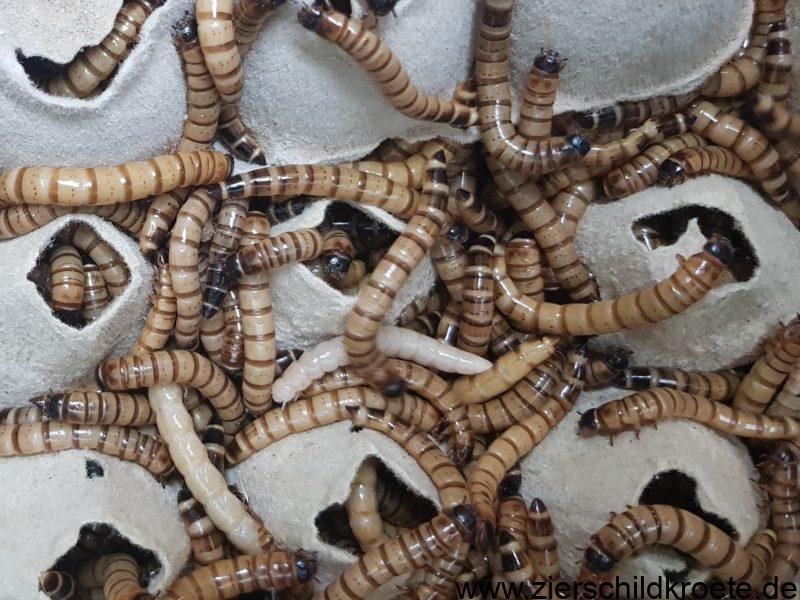 Das was wie große Mehlwürmer aussieht sind Larven des Großen Schwarzkäfers Zophobas morio. Sie enthalten wie Mehlwürmer ebenfalls viel Fett. Noch mehr Fett enthalten Tebo-Raupen und Wachsmaden. Diese fettreichen „Würmer“ sollten nur selten als Leckerli verfüttert werden.