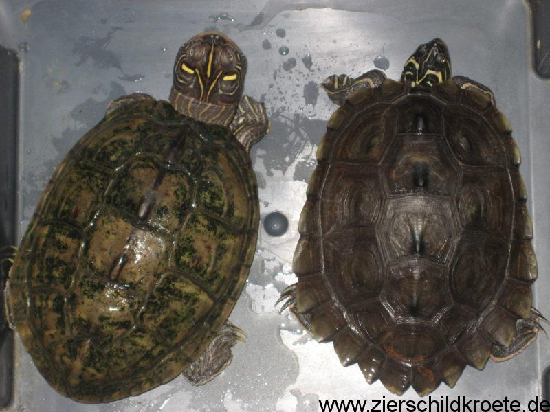 Nun, auf dem folgenden Bild sind zwei gleich große Höckerschildkröten abgebildet, ihre Köpfe sind allerdings „leicht“ unterschiedlich groß. Rechts eine schmalköpfige Schwarzknopf-Höckerschildkröte (Graptemys nigrinoda nigrinoda) und links eine Falsche Landkarten-Höckerschildkröte (Graptemys pseudogeographica pseudogeographica), die zu den Arten mit mittelgroßen Köpfen gehört.