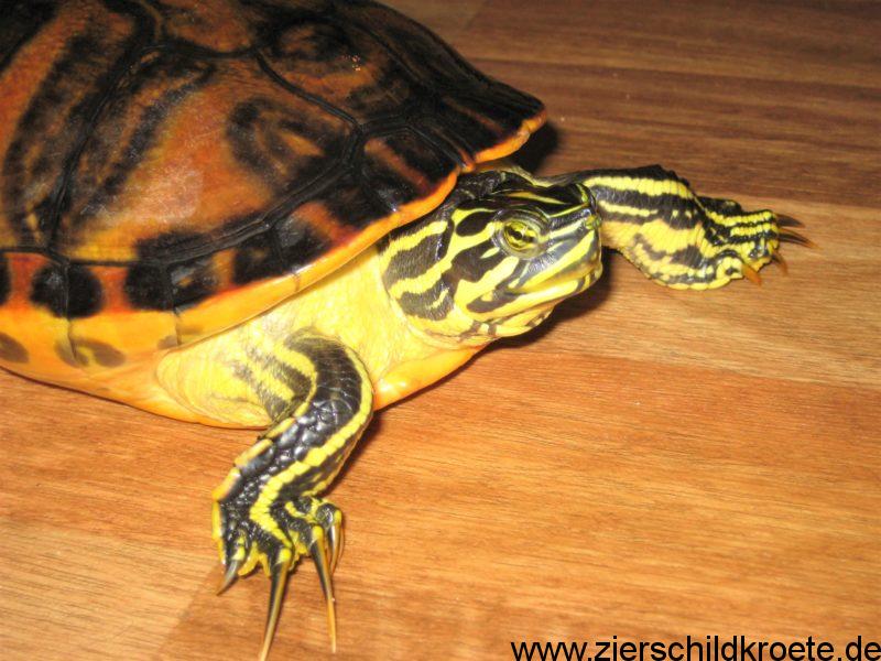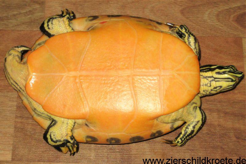 Deutsche Namen können manchmal verwirren. So richtig rot ist der Bauchpanzer einer Florida-Rotbauch-Schmuckschildkröte (Pseudemys nelsoni) nämlich nicht. Als Schlüpfling ist er maximal orange, meistens aber eher gelb. Bei ausgewachsenen Florida-Rotbauch-Schmuckschildkröten ist der Bauch dunkel-gelb. Wirklich rot ist der Bauchpanzer der Nördlichen Rotbauch-Schmuckschildkröte (Pseudemys rubriventris).