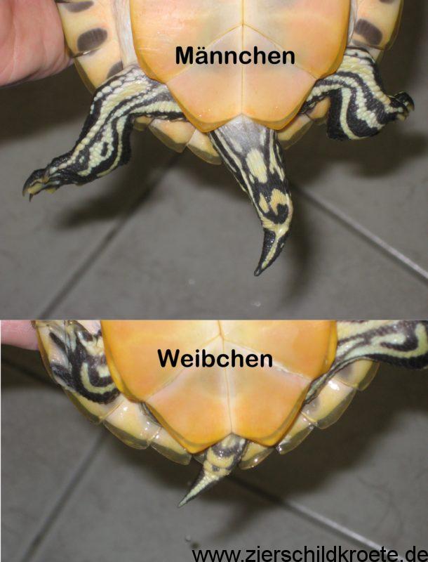 Zur Unterscheidung von Männchen und Weibchen sollte deine Florida-Rotbauch-Schmuckschildkröte wenigstens 12 cm, besser 15 cm Panzerlänge haben. Bis dahin sehen alle aus wie Weibchen. Männchen erkennst du an den verlängerten Krallen an den Vordergliedmaßen, bei Weibchen sind sie kürzer. Außerdem haben Männchen längere und kräftigere Schwänze als Weibchen.