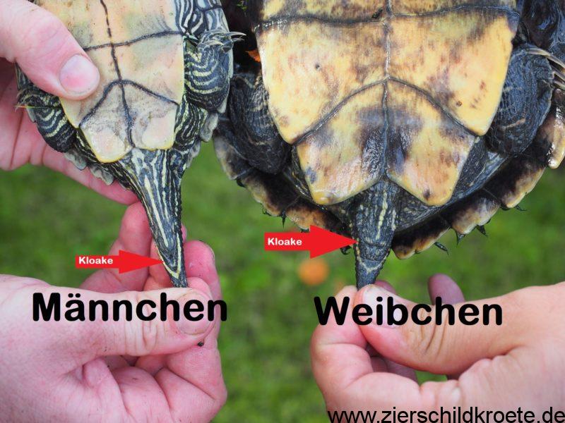 Zudem sind die Schwänze der Männchen in der Regel dicker. Außerdem liegt die Kloake bei weiblichen Wasserschildkröten bei ausgestrecktem Schwanz in der Regel in Höhe des Panzerrandes. Bei männlichen Wasserschildkröten liegt sie weit außerhalb. Die Kloake ist der gemeinsame Körperausgang der Reptilien für Kot, Urin und Geschlechtsorgane.