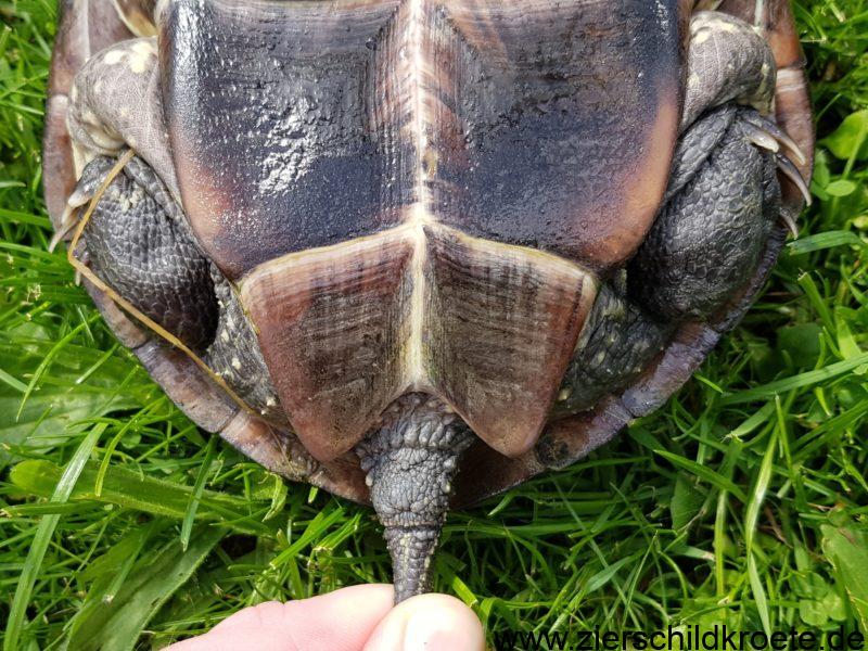 Männliche Chinesische Dreikielschildkröten werden fast immer melanistisch, werden also fast komplett schwarz. Das kann man zur Geschlechtsbestimmung heranziehen, weil Weibchen fast nie komplett schwarz werden. Aber Obacht: bei Teichhaltung können auch Weibchen schwarz werden.