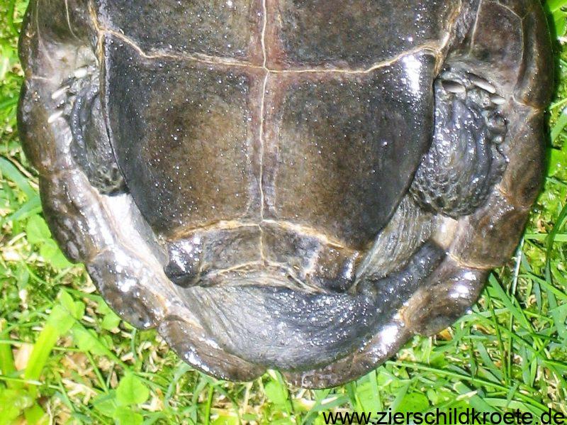 Der Bauchpanzer von Weibchen ist flach, bei männlichen Chinesischen Dreikielschildkröten manchmal leicht konkav.