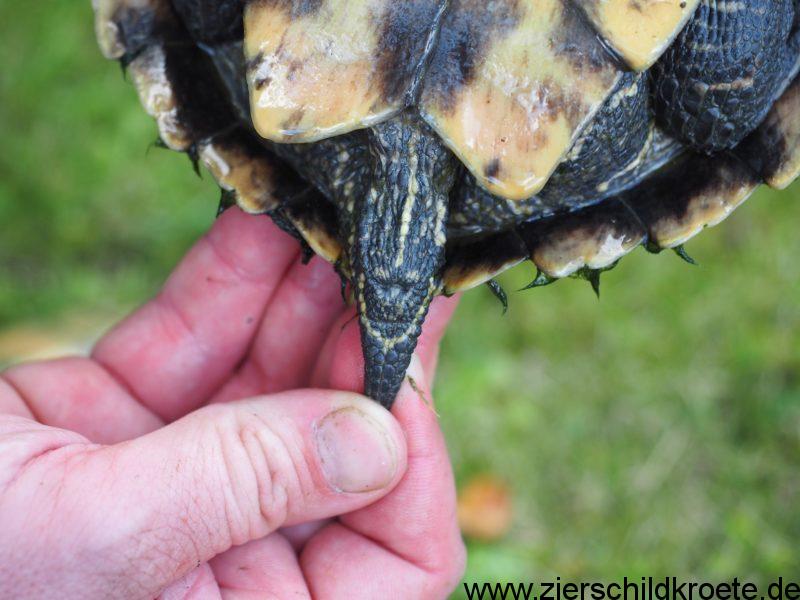 Bei weiblichen Höckerschildkröten ist der Schwanz relativ kurz. Die Kloake befindet sich bei ausgestrecktem Schwanz etwa in Höhe des Panzerrandes.