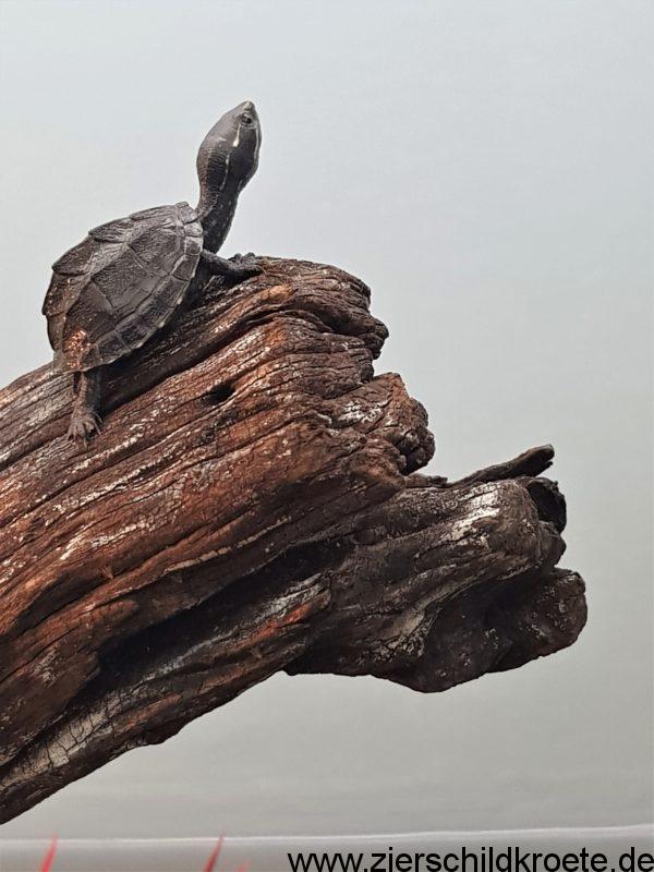 Für Jungtiere ist eine Weidenholzbrücke als Landteil ideal. Man kann sie halbrund biegen und auf den Bodengrund stellen. So kann die junge Sternotherus odoratus bequem kletternd die Wasseroberfläche erreichen. Unter der Weidenholzbrücke kann die Wasserschildkröte zudem sich verstecken. Aus diesem Versteck kann sie auch schnell und gefahrlos flüchten, falls sie sich vor etwas erschrickt. Gerne wird nämlich erzählt, dass junge Moschusschildkröten in einem Versteck sonst ertrinken würden. Ob es stimmt? Ich glaube nicht daran, aber man kann ja auf Nummer Sicher gehen.