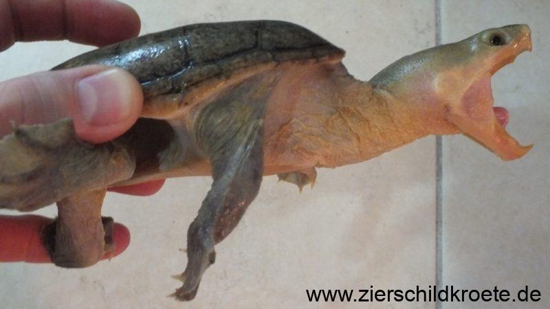 Keine Schildkrötenart ist von der Bauchseite her weniger geschützt als Claudius. Hieraus ergibt sich möglicherweise die extreme Aggressivität der Art. Sobald man sich den Tieren nähert, reißen sie das Maul auf und drohen und beißen oftmals mit voller Wucht gegen die Scheibe, dass es knallt! Man musst beim Anfassen der Tiere gut auf seine Finger achtgeben.