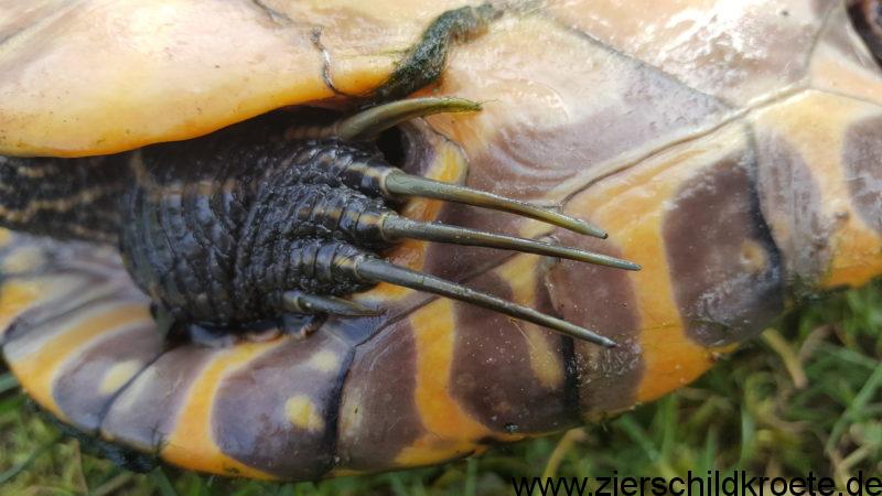Außerdem ist es noch anhand der Schwanzlänge möglich die Geschlechter zu unterscheiden, dazu mehr auf der Seite Geschlechtsbestimmung bei Schmuckschildkröten.