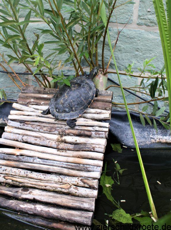 Der Sonnenplatz muss so gestaltet werden dass die Schildkröten darauf komplett abtrocknen können. Vor allem muss er auch sehr stabil sein, ausgewachsene Hieroglyphen-Schmuckschildkröten bringen mehrere Kilogramm auf die Waage. Für Jungtiere können die käuflichen Schildkröteninseln und Korkröhren noch ausreichen, später muss es deutlich stabiler sein. Gut geeignet sind zum Beispiel Birgits Aquarienaufsätze. Viele weitere Ideen gibt es in der Landteile-Rubrik.