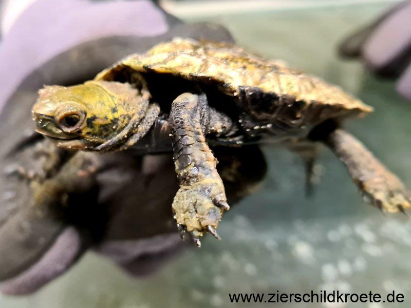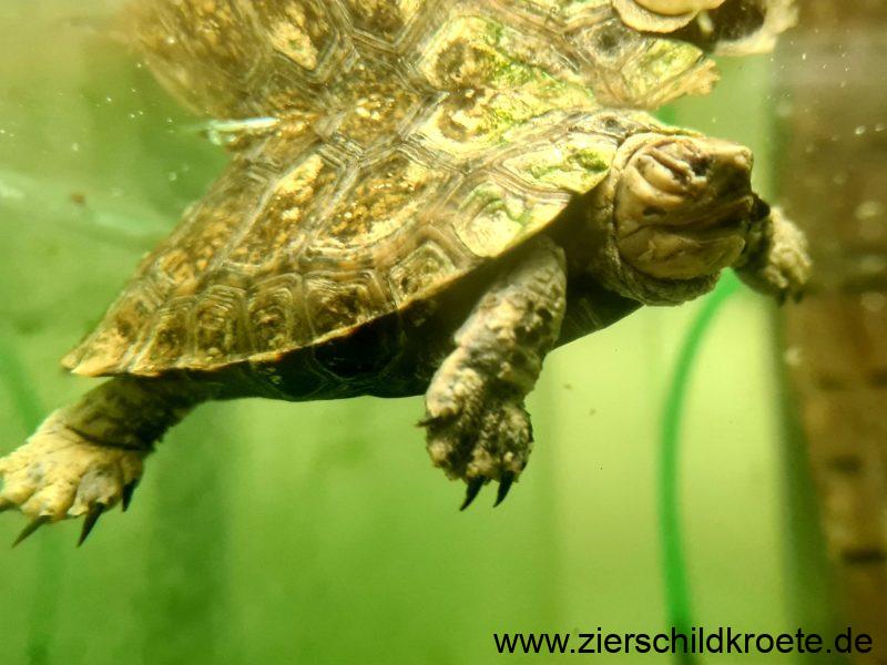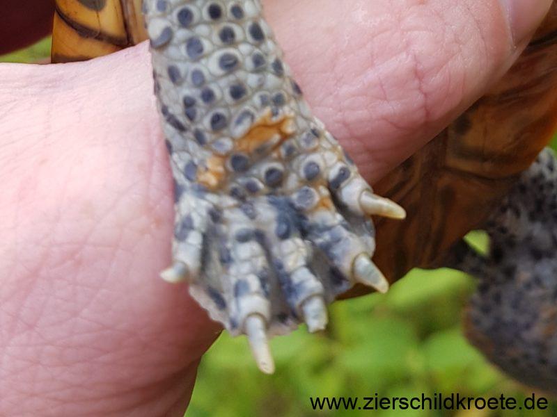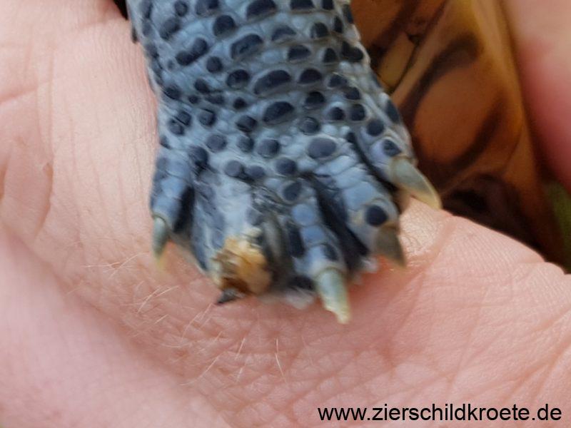 Von vielen Schildkrötenhalter:innen wird diese Erkrankung auch als „Pilz“ bezeichnet, weil die Haut aussieht als wäre sie von einem Pilz befallen. Aber meistens ist es halt doch kein Hautpilz, sondern eine bakterielle Entzündung der Haut. Bei manchen Exemplaren sieht die Veränderung auch „käsig“ aus, oft beginnt es aber zunächst mit Rötungen und Bläschen. Unbehandelt können ganze Krallen oder Gliedmaßen an der Erkrankung absterben. Im schlimmsten Fall stirbt sogar die ganze Schildkröte.