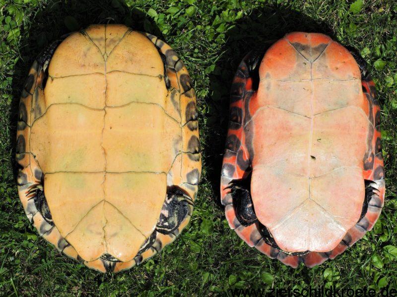 Weibliche Nördliche Rotbauch-Schmuckschildkröten erreichen mit einer Panzerlänge von 23-24 cm die Geschlechtsreife, Männchen werden früher geschlechtsreif (SWARTH 2004).