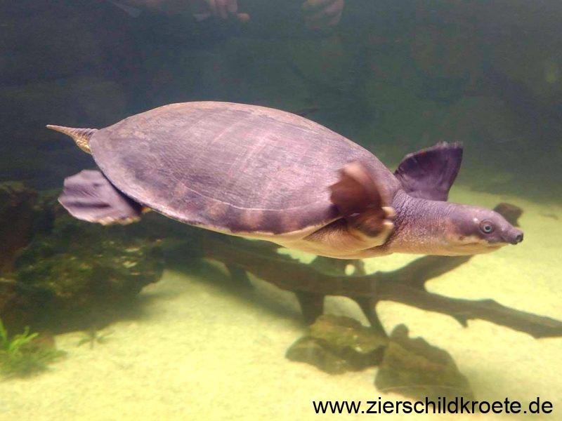Eine Papua-Weichschildkröte aus dem Aquarium herausnehmen, sollte man nur wenn es wirklich unbedingt notwendig ist. Sie fuchteln mit ihren Flossen dann wie wild und sind mit ihrer glatten, ledrigen Haut nur schwer zu greifen. Außerhalb des Wassers färbt sich der Bauchpanzer von Carettochelys insculpta schnell rötlich, das Blut sackt förmlich nach unten, wenn der Wasserdruck fehlt. Das kann sogar zu Blutergüssen führen. Daher müssen insbesondere größere Papua-Weichschildkröten auf weichen Handtüchern oder besser in flachem Wasser transportiert werden.