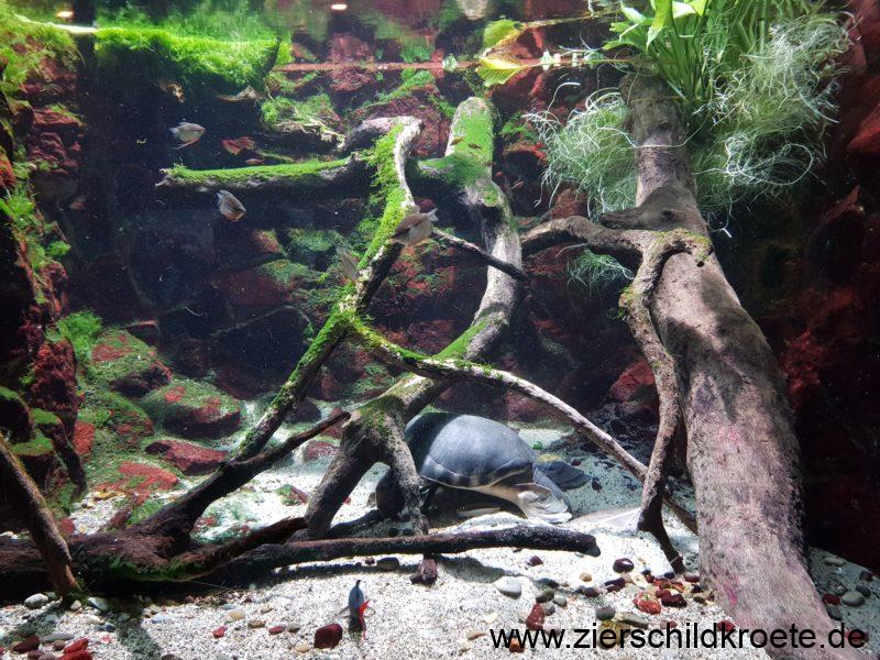Das Aquarium für diese schwimmfreudigen Schildkröten sollte eine Länge von der 8fachen Panzerlänge haben und einen Wasserstand von mindestens der 3-5fachen Panzerlänge. Sprich: für ausgewachsene Papua-Weichschildkröten muss das Aquarium 4,5 m lang sein bei einem Wasserstand von etwa 2 m. Kann man sicherlich irgendwie im Wohnzimmer realisieren, aber kostet natürlich.