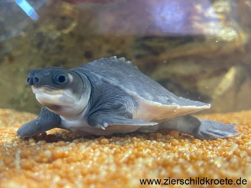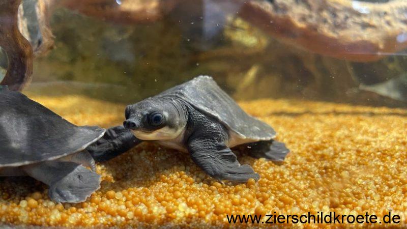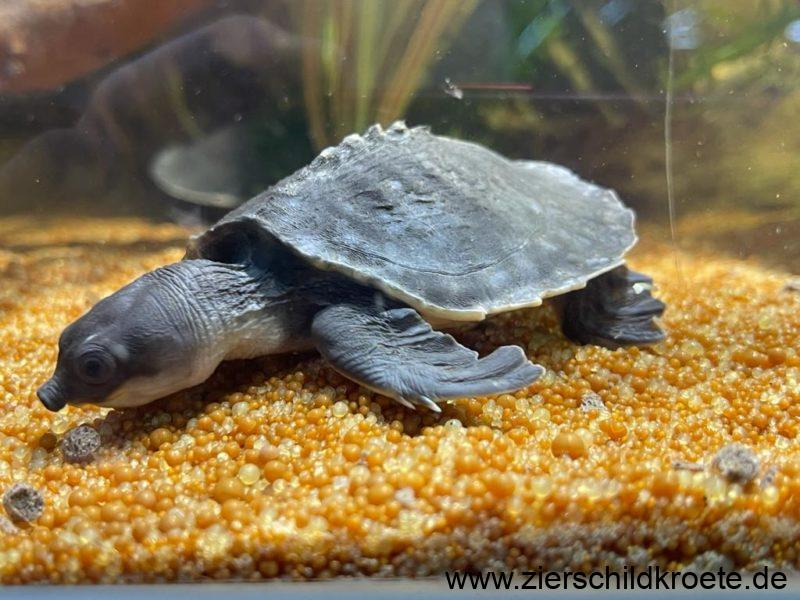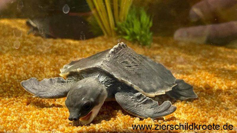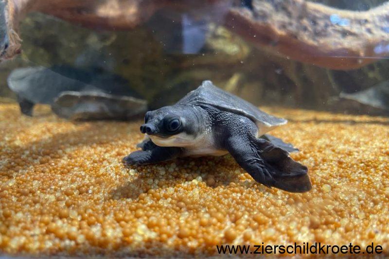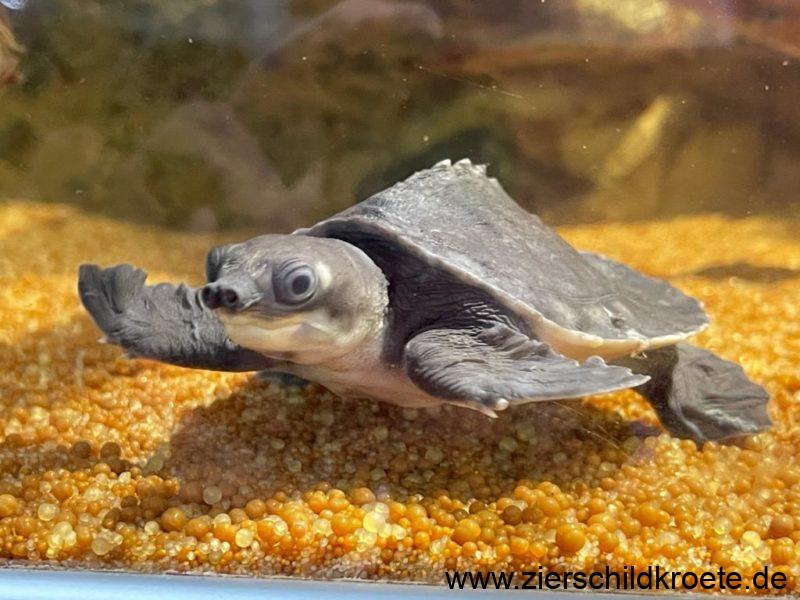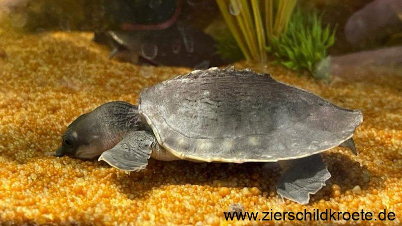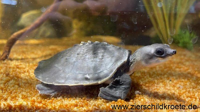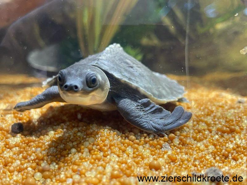 Die Papua-Weichschildkröte ist eine relativ groß werdende Wasserschildkröte. Beim Schlupf sind Carettochelys insculpta gerade einmal 4-5 cm lang und wiegen 25-30 g, sie erreichen aber später eine Panzerlänge von bis zu 57 cm bei einem Gewicht von bis zu 22 kg. Wobei die Tiere in Australien kleiner bleiben als in Neuguinea (GEORGES et al. 2008). Für ein „normales“ Aquarium sind diese Schildkröten also nicht geeignet.