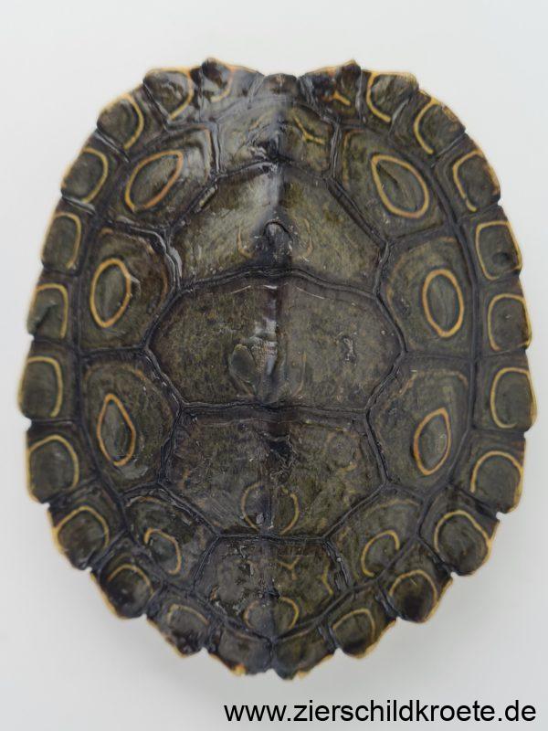 Der Name ist Programm, die Pracht-Höckerschildkröte ist eine prächtige Wasserschildkröte. Sie hat auf jedem Panzerschild eine rundes Zeichnungselement. So ist sie auch zu ihrem wissenschaftlichen Artnamen gekommen. oculus ist lateinisch für Auge. Der zweite Namensbestandteil fero ist ebenfalls Latein und kann man mit tragen übersetzen. Oftmals sieht man als Übersetzung auch Ringe für oculus, das stimmt nicht wirklich. Ring auf Latein wäre circus oder anulus.