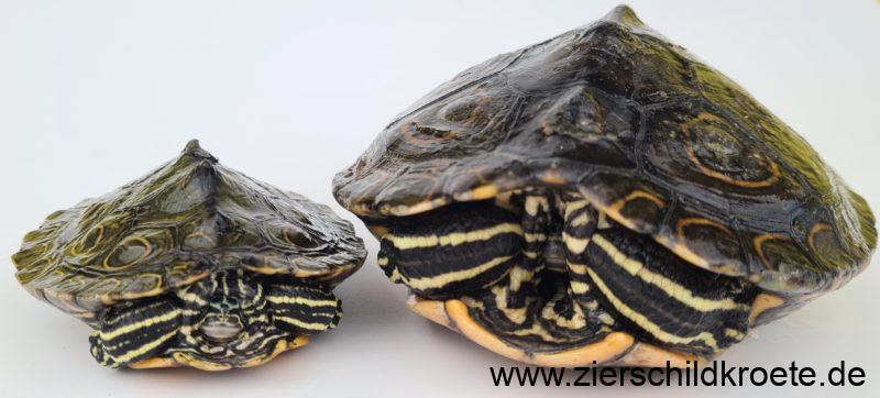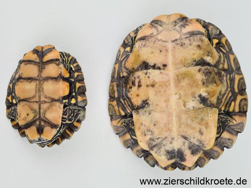 Wenn du einen oder mehrere Schlüpflinge kaufst, so empfehle ich zunächst ein 80 cm-Aquarium. Das genügt für die ersten Jahre und du kannst dann später, sobald man das Geschlecht erkennen kann, die für ausgewachsene Exemplare empfohlene Beckengröße anschaffen. Das kleinere Aquarium hat den Vorteil, dass du die kleinen Babys nicht ewig im Aquarium suchen musst. So hast du eine bessere Kontrolle über das Fressverhalten und den Gesundheitszustand deiner Wasserschildkröten. Selbst bei Jungtieren kann der Wasserstand aber ruhig schon 20 cm betragen und im Laufe des Wachstums weiter angehoben werden.