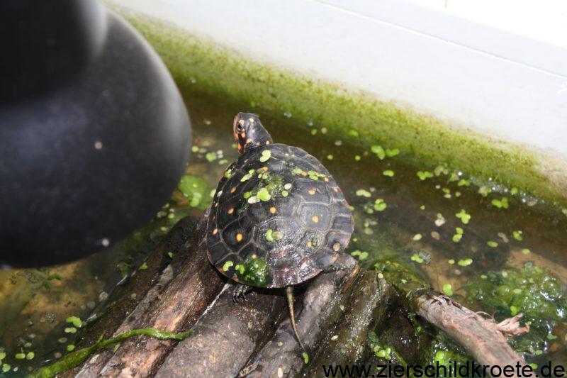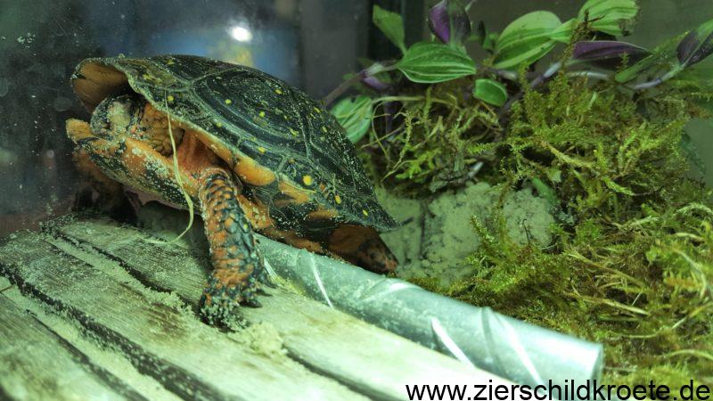 Obwohl die Tropfenschildkröte in der Natur einen gewissen pflanzlichen Anteil frisst, so wachsen bei meinen Tropfenschildkröten im Aquarium viele Wasserpflanzen (Wasserlinsen, Hornkraut) und im Aquarium wurzeln bis weit über die Wasseroberfläche einige andere Pflanzen (Drachenbaum, Fitonien, Lobelien). Lediglich im Hochsommer „naschen“ meine Tiere einmal an den Wasserpflanzen.