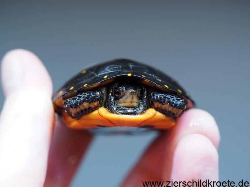 Der Bauchpanzer und die Haut tragen eine orange-schwarze Zeichnung. Beliebt ist die Tropfenschildkröte jedoch nicht in erster Linie aufgrund der hübschen Gestalt, sondern weil sie sehr klein bleibt. Clemmys guttata gehört mit einer maximalen Panzerlänge von 14,25 cm (HAXTON 1998) zu den kleinsten Wasserschildkröten, männliche Tiere bleiben mit bis zu 12,2 cm (HAXTON & BERRILL 1999) kleiner. In der Regel erreichen die Schildkröten diese Maximalwerte aber auch nicht.