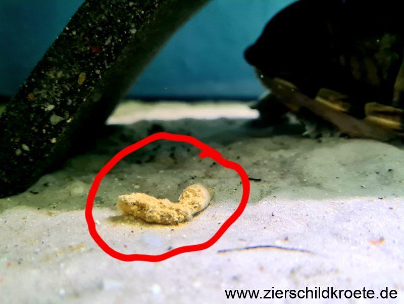 Das ist die Regel. Der Kot von Wasserschildkröten löst sich im Wasser relativ schnell in kleinste Partikel auf und wird vom Filter aufgenommen oder wird Teil der Mulmschicht am Boden. Bei grobem Bodengrund (Kies) sickern kleine Kotbestandteile in die Zwischenräume.