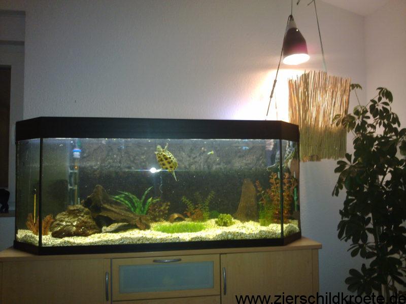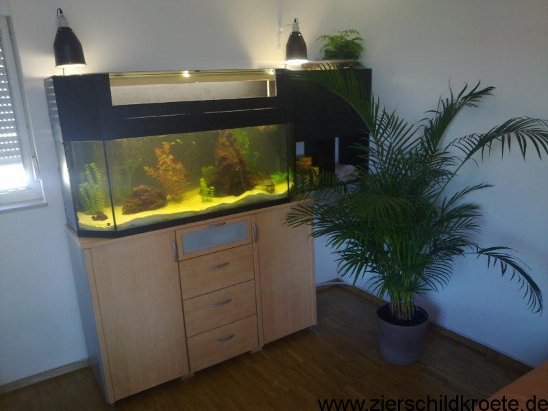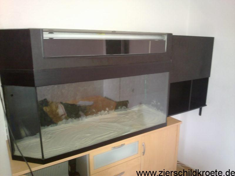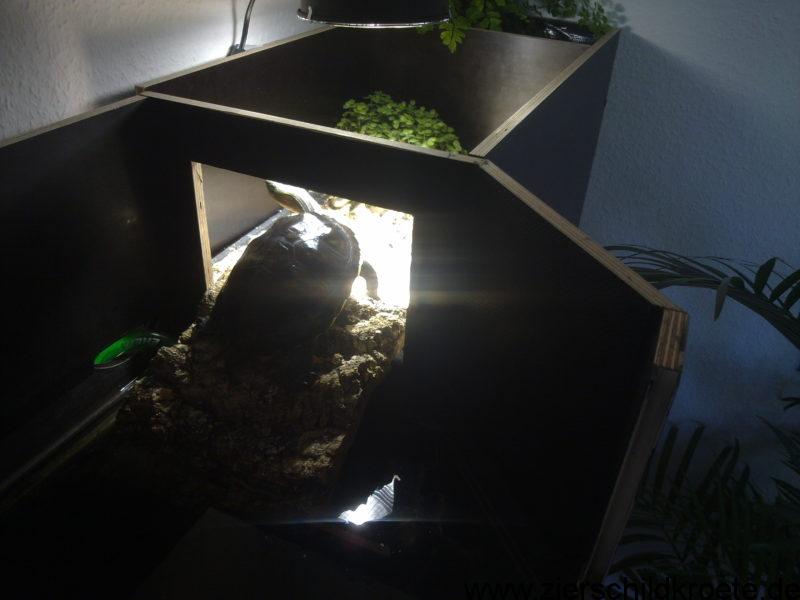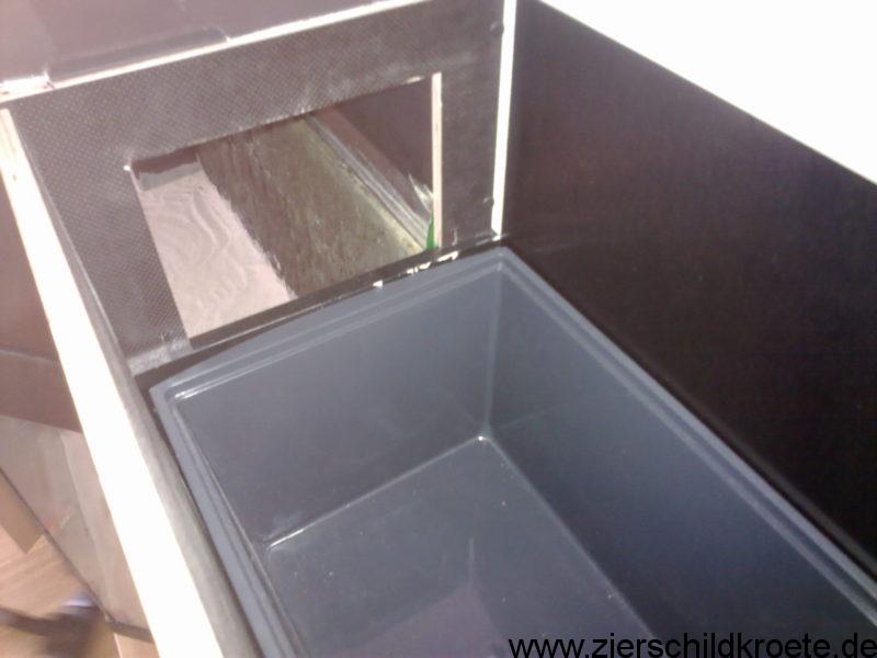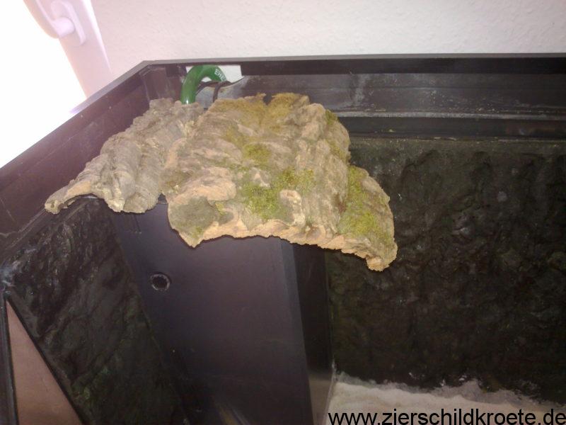 Als letztes wollte ich ja noch einen zusätzlichen Sonnenplatz anbieten. In meinem Aquarium ist in der rechten Ecke ein Plastikkasten fest verbaut, der wohl mal als Hülle für einen Innenfilter gedacht war. Darin verstecke ich meine gesamte Technik (Heizstab, Ausströmer usw.) und setzte oben drauf, natürlich abnehmbar, einen zweiten Sonnenplatz aus Kork. Dazu habe ich den Kork auf eine schwarze Plastikplatte geklebt und diese Platte unten mit U- Profilen in den gleichen Maßen wie der Rand des schwarzen Kastens beklebt. Somit kann der Sonnenplatz zwar nicht durch die Schildkröten „abgebaut“ werden, ist jedoch für mich jederzeit einfach abzunehmen um gegebenenfalls an der Technik was zu ändern/ersetzen.