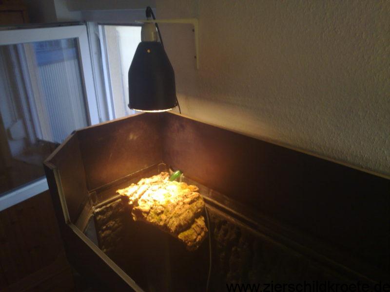 Die Beleuchtung habe ich vollständig ersetzt. Nun sind als Grundbeleuchtung 2 x Osram Active Cool White 36 Watt, für den linken Sonnenplatz ein PAR 38 Wärmestrahler und für den Eiablageplatz eine Bright Sun 70 Watt Jungle im Einsatz.