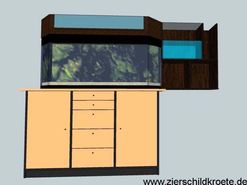 Ziel des Umbaus sollte es sein, den bisher genutzten groben Kies durch feinen Quarzsand zu ersetzen, einen zweiten Sonnenplatz anzubieten und den Eiablageplatz größer, geschützter und besser erreichbar zu gestalten. Dafür wollte ich mein bisher genutztes Becken benutzen, welches durch seine sechs, anstatt vier Ecken mir optisch gut gefällt, den Umbau jedoch schwieriger gestaltete. Weiter war es mir wichtig, das Aquarium oben größtenteils geschlossen zu halten, da ich in der Vergangenheit mit einem offenen Becken Probleme mit der Luftfeuchtigkeit bekam. Zudem möchte ich meinen Schildkröten so viel Schwimmraum wie möglich zur Verfügung stellen und somit das Aquarium vollständig füllen. Das sind soweit meine Vorgaben. Zur Planung benutzte ich das kostenlos im Internet verfügbare „Google Sketchup“ und fertigte folgende Zeichnung an.