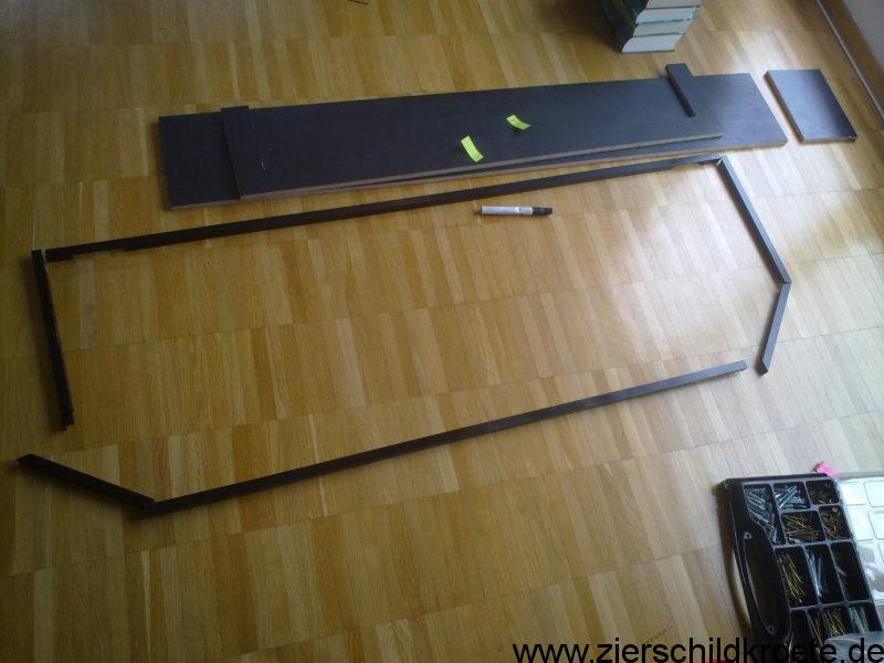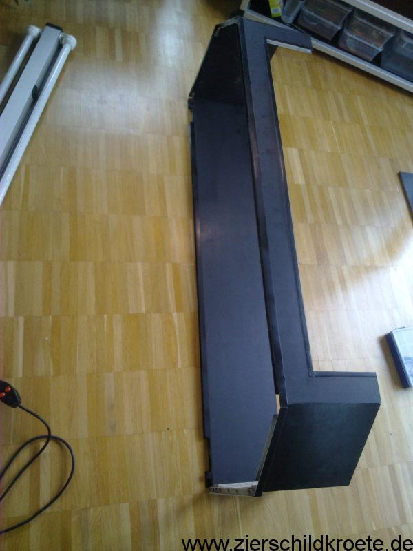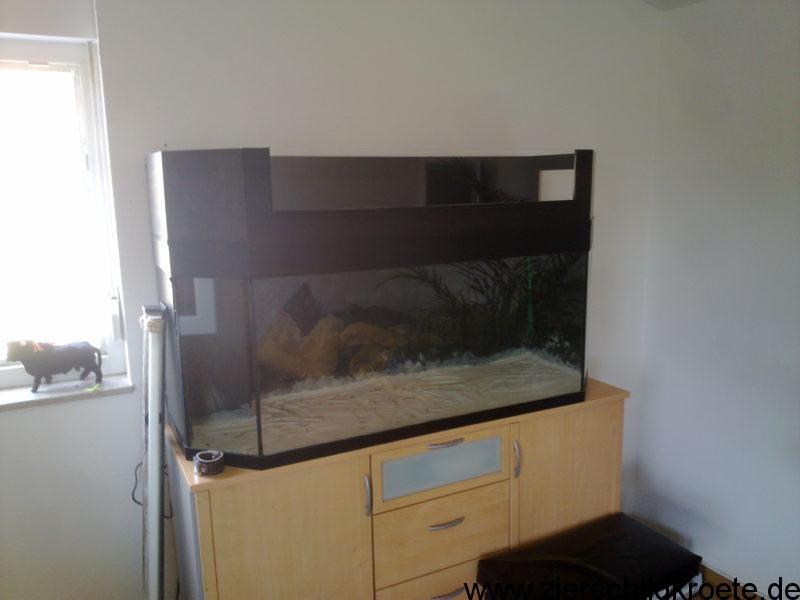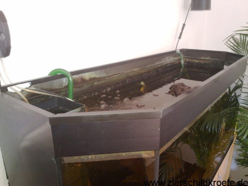 Das Aquarium sollte durch einen Holzrahmen aus Siebdruckplatten erhöht werden, um mehr Platz zwischen der Beleuchtung und der Wasseroberfläche zu haben. Die einzelnen Holzelemente wurden miteinander verschraubt oder an den schrägen Kanten miteinander verklebt und auf U-Profile geschraubt. Diese U-Profile (Plastik) passen genau auf den Rand des Aquariums und geben dem Holzrahmen halt. Vorne wurde ein Fenster aus Plexiglas integriert, um auch oberhalb der Wasseroberfläche ins Becken schauen zu können. Durch die Konstruktion ist der Holzrahmen bei längeren Arbeiten im Aquarium wieder leicht zu entnehmen.